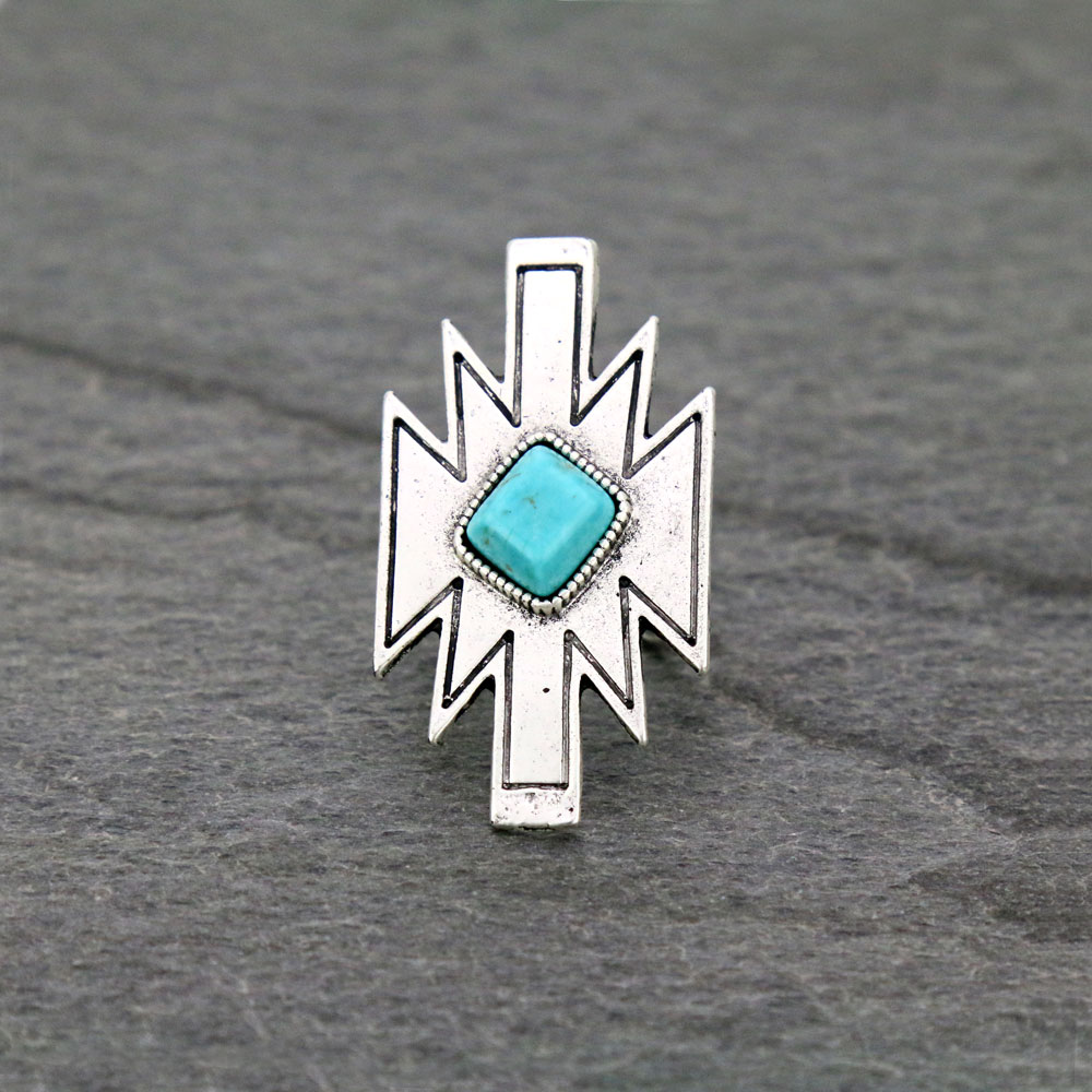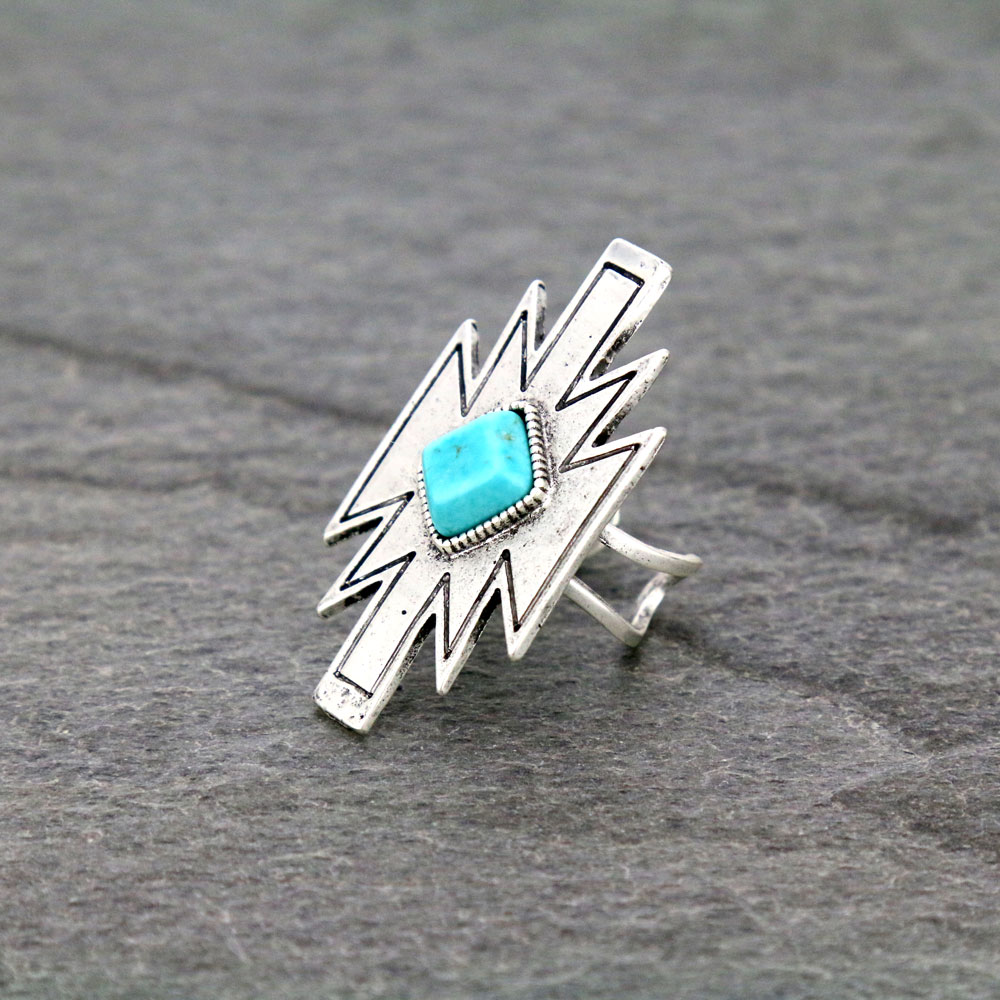 Long Silver Aztec Tribal Turquoise Stone Ring